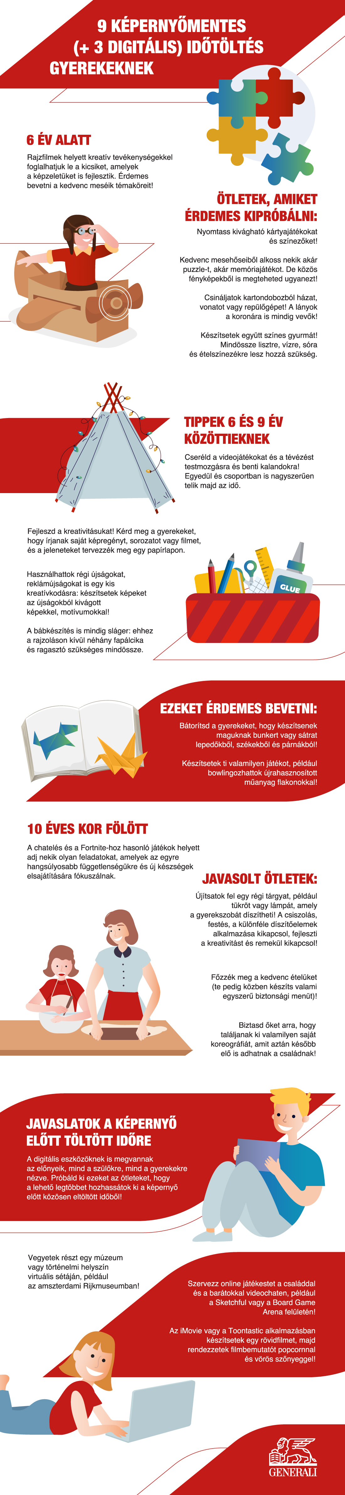 Infografikánkon kreatív és egyszerű ötleteket mutatunk be, amelyeket könnyen bevethetnek a szülők a kütyük helyett. A tevékenységek tanulásra, kreativitásra és mozgásra sarkallják a gyerekeket, és minden korosztály jól szórakozhat velük.